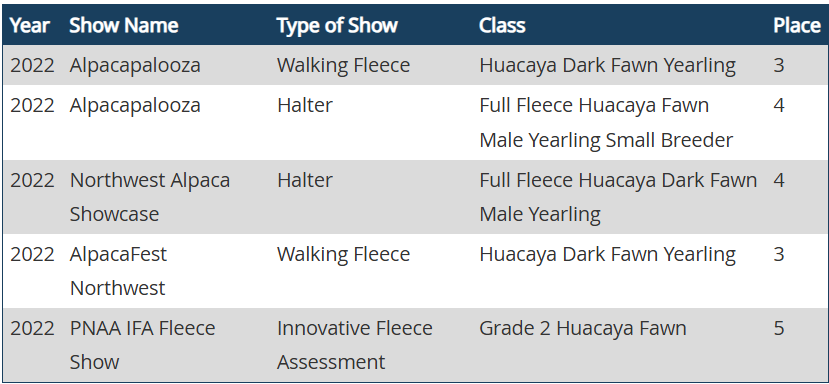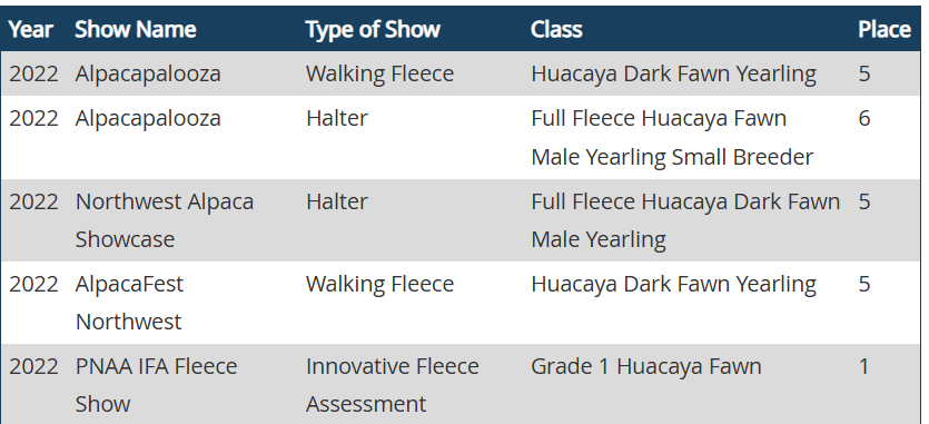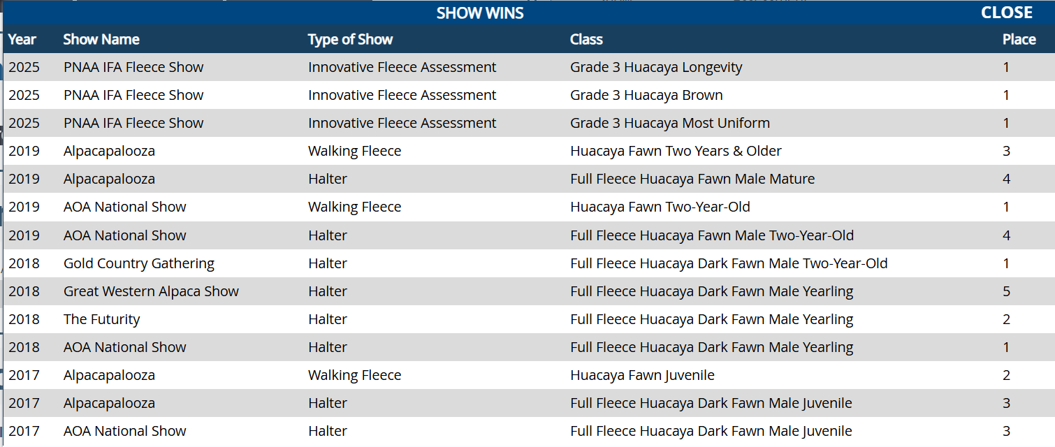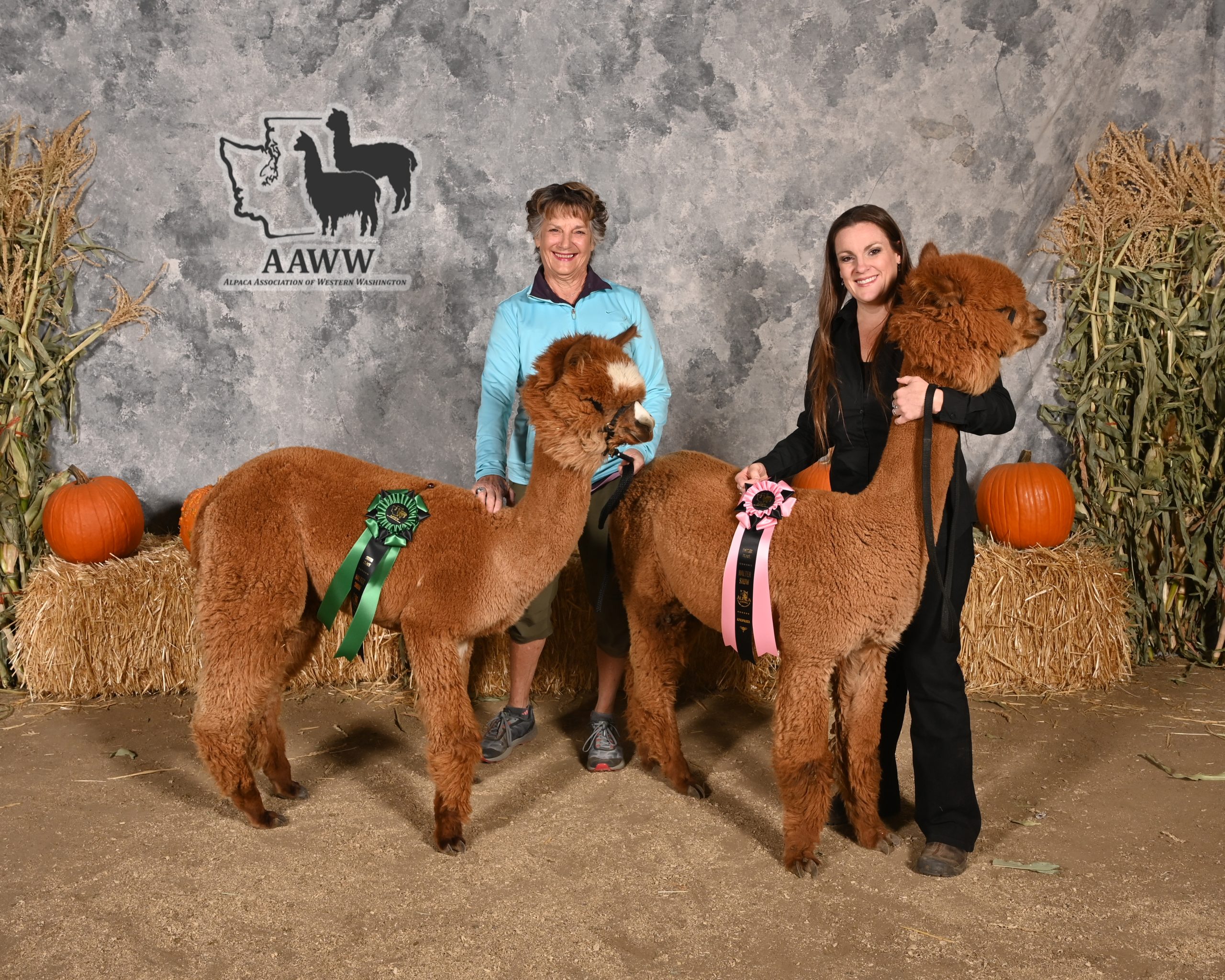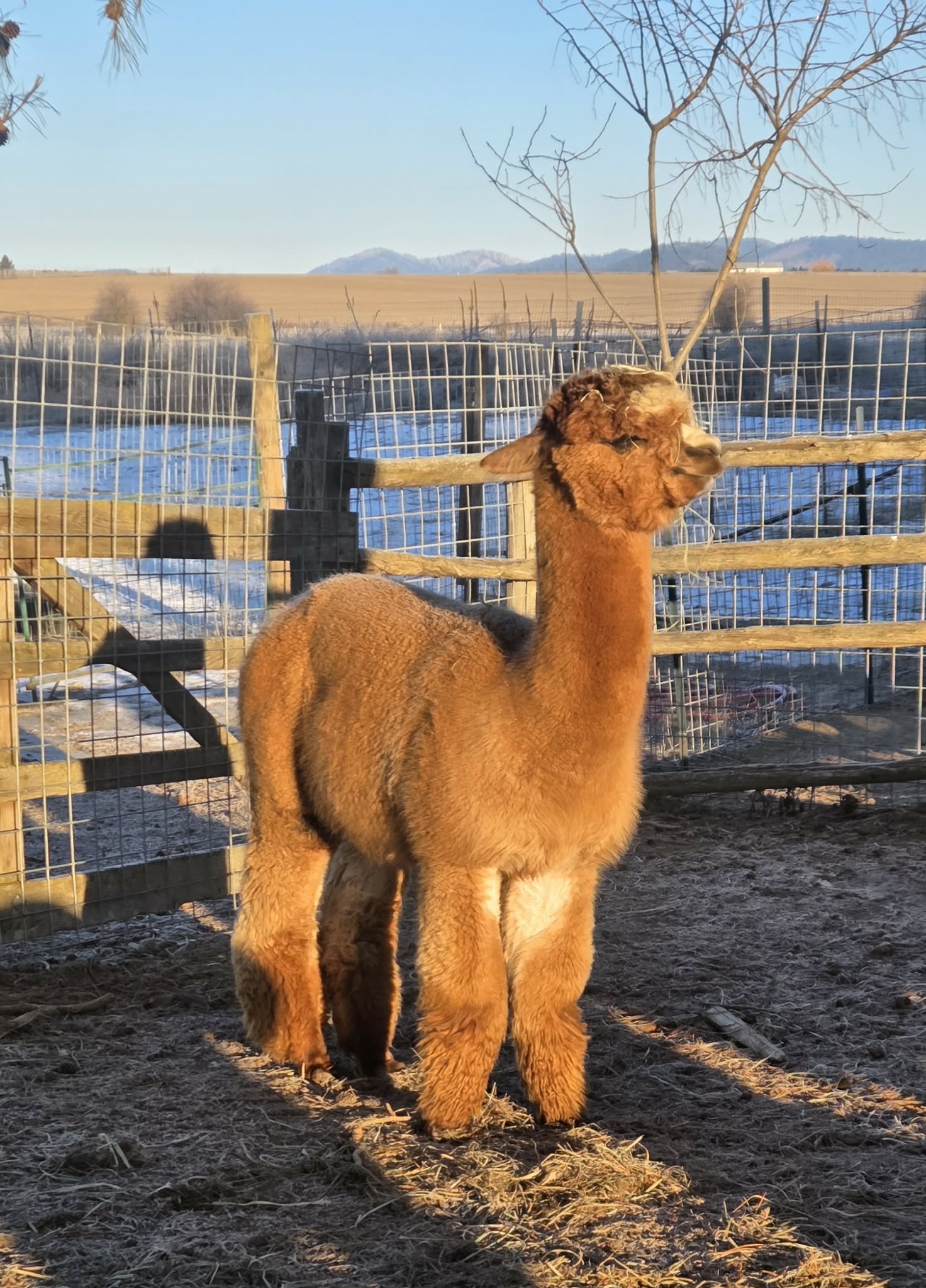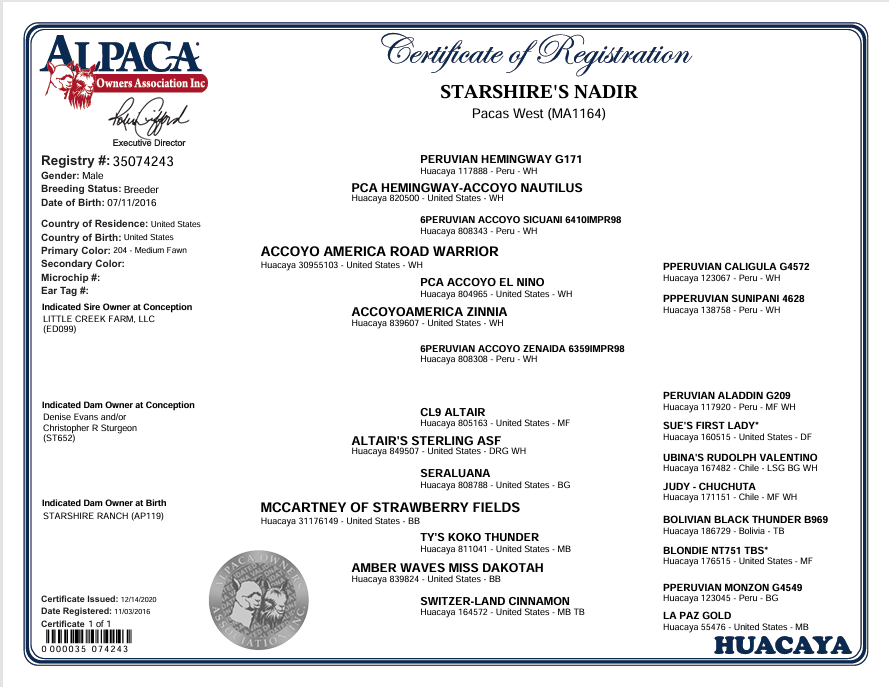 Nadir's offspring all posses his density, crimp, and easy going personality. Nadir has produced all colors of crias, as he has most colors in his background, with the exception of silver gray. If you're looking for a true white, true black, or beautiful fawn, Nadir is your guy!