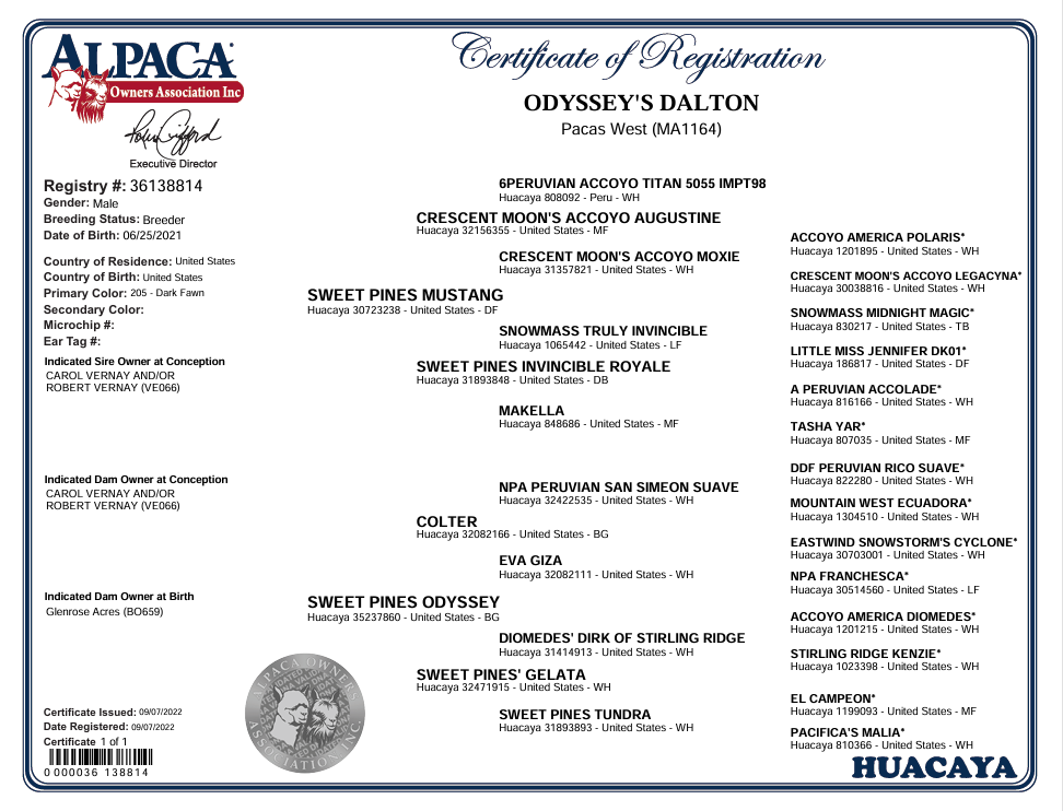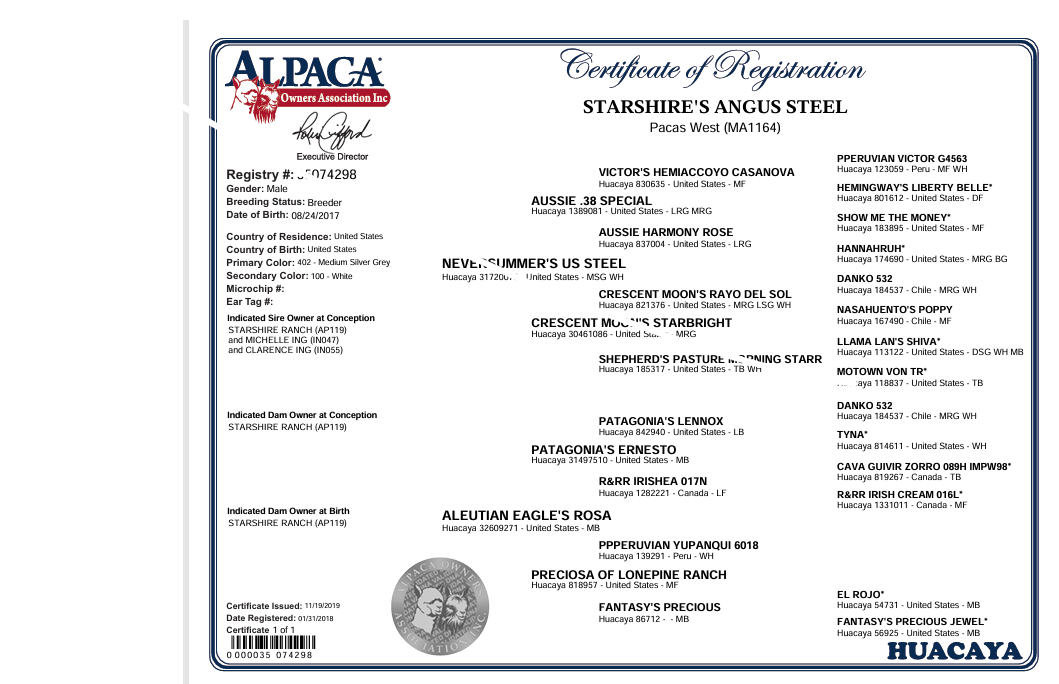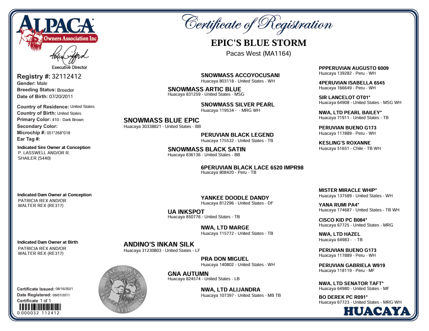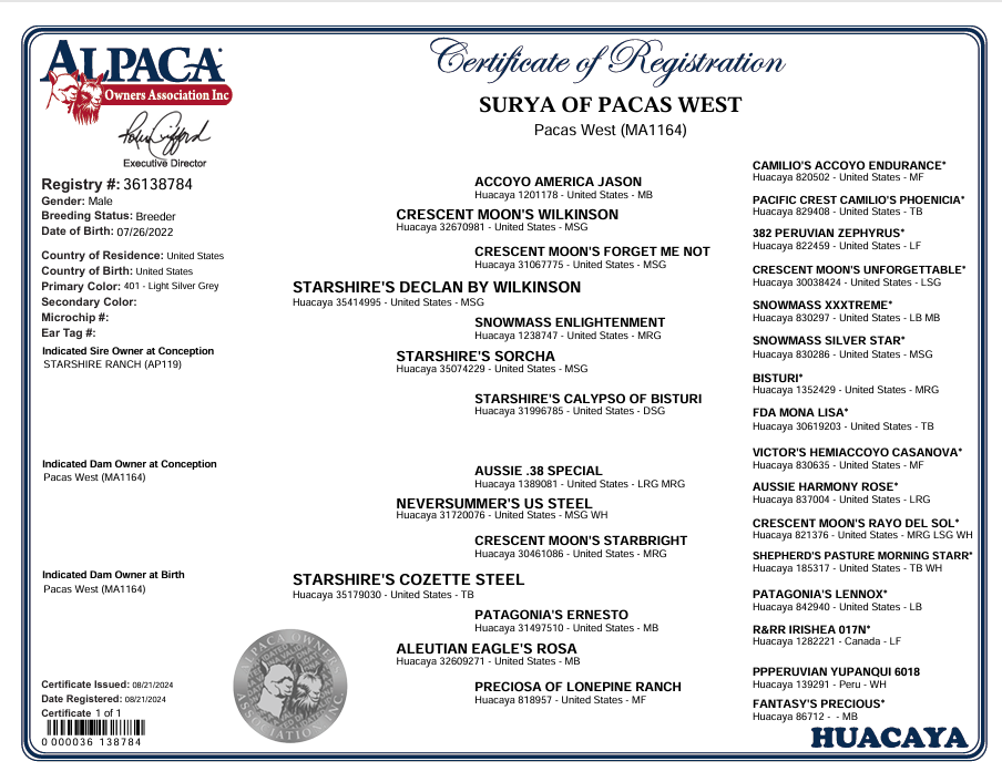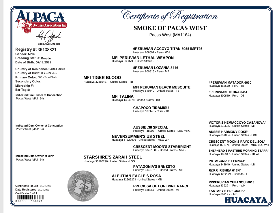 Angus' breeding career has been limited, through no fault of his own. His one cria was a beautiful rose gray; sadly, we lost Little Bug early on. We believe Angus will throw true black and silver gray, true to himself and his sire, as well as to his sisters, whom we own, which is why he has not had many opportunities to breed on our ranch. His sisters and nephews posses the same lustrous, zipper crimpy,