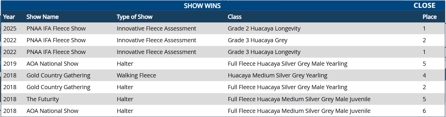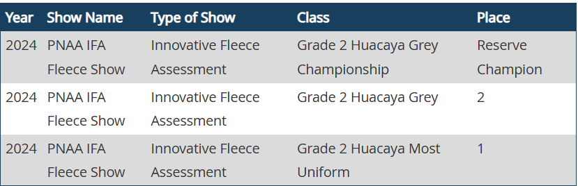 At age 7, Angus is still retaining his fleece quality, being fine and lustrous. He has taken 1st Place in both 2022 and 2025 for Longevity at the IFA show and placed 2nd in 2022 for Grade 3 Gray Fleece.