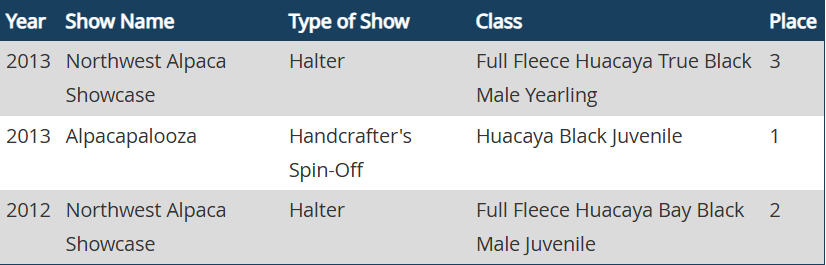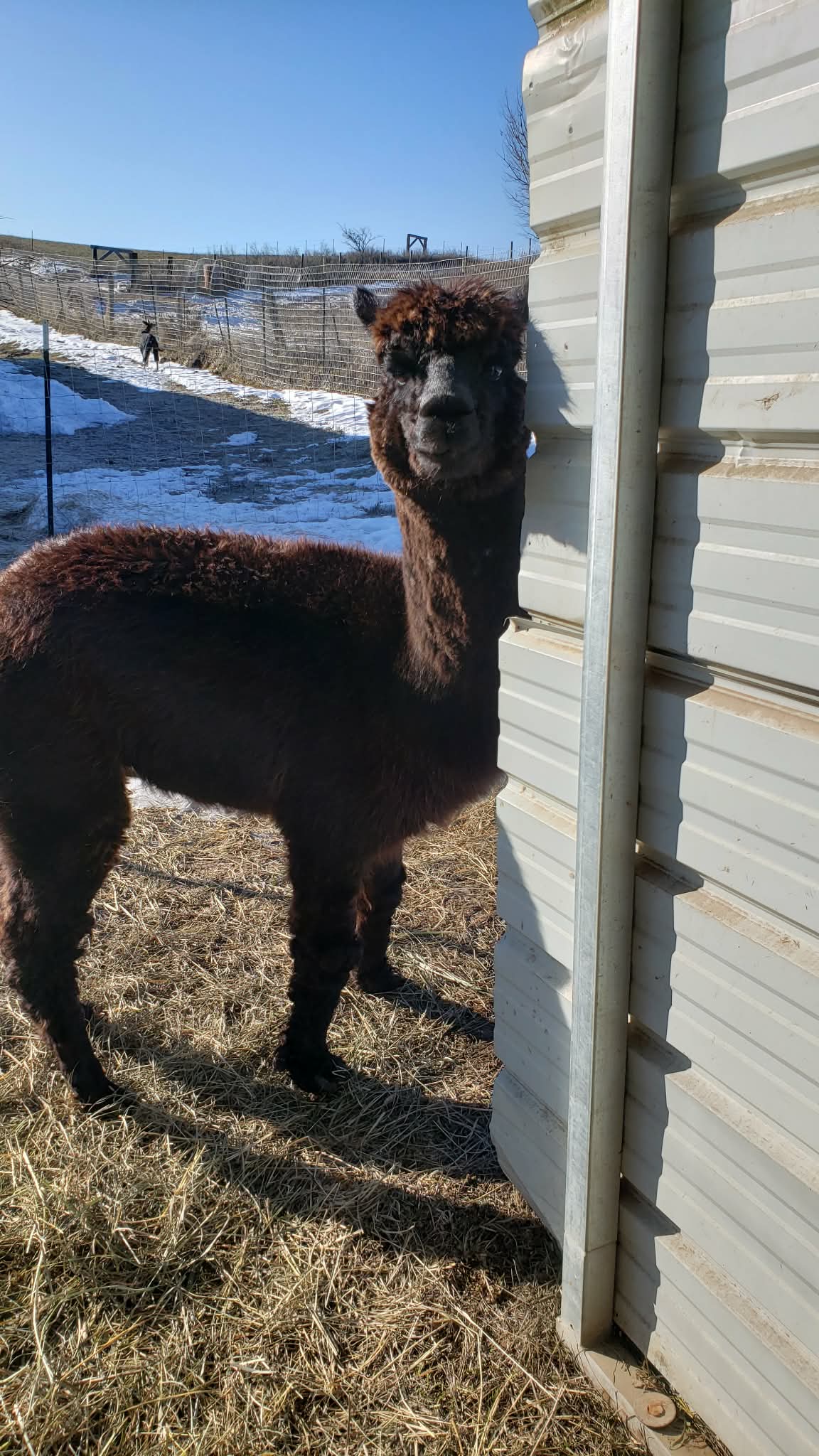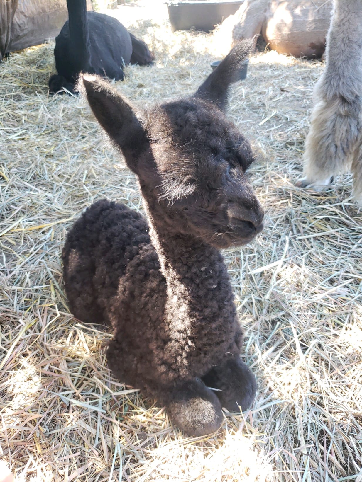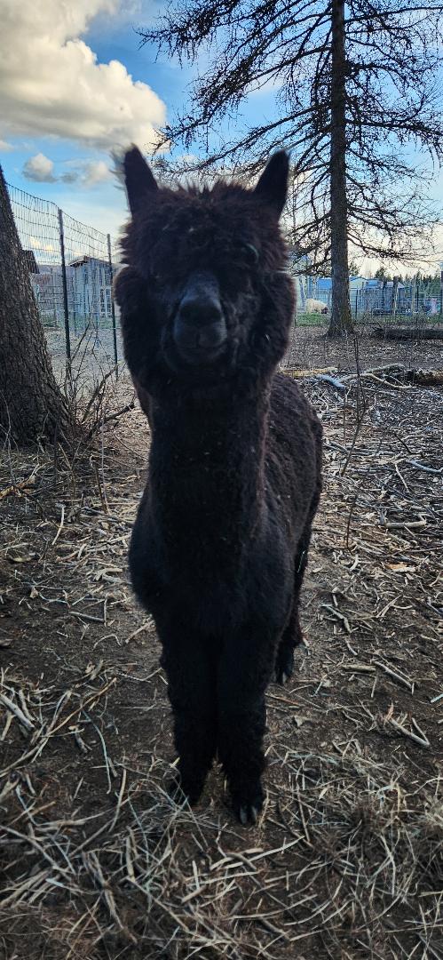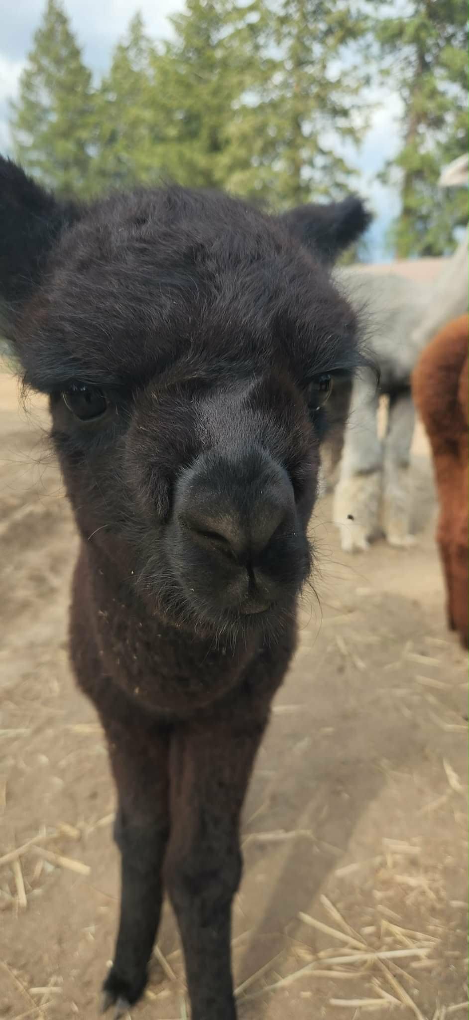 If you are looking for a fiber animal or just a cute baby and pet, Storm is your guy! Storm is calm and sweet, and that comes through in his offspring. He produces nearly 5lbs of dense, beautiful bay black fiber every year at shearing. While his micron count is not fine, it is just right for hobby fiber arts. All of his cria have had beautifully soft, dense fleece and I always sell out of their fiber.