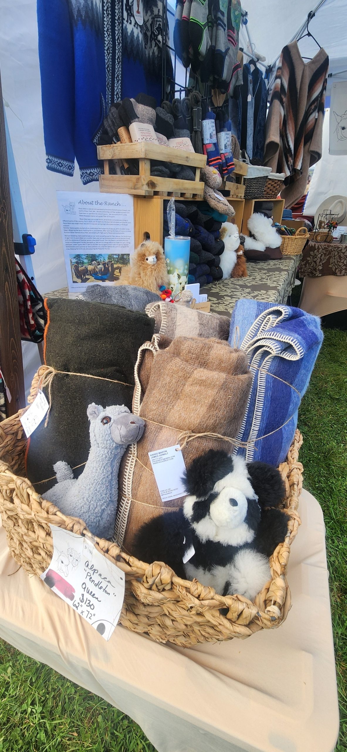 Come visit us in the park, we always have an assortment of socks, alpaca gifts, yarn, and those oooh soo cute stuffed alpacas!